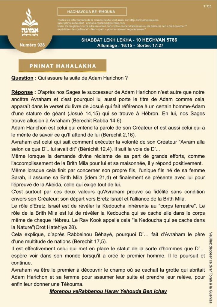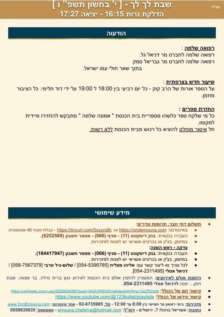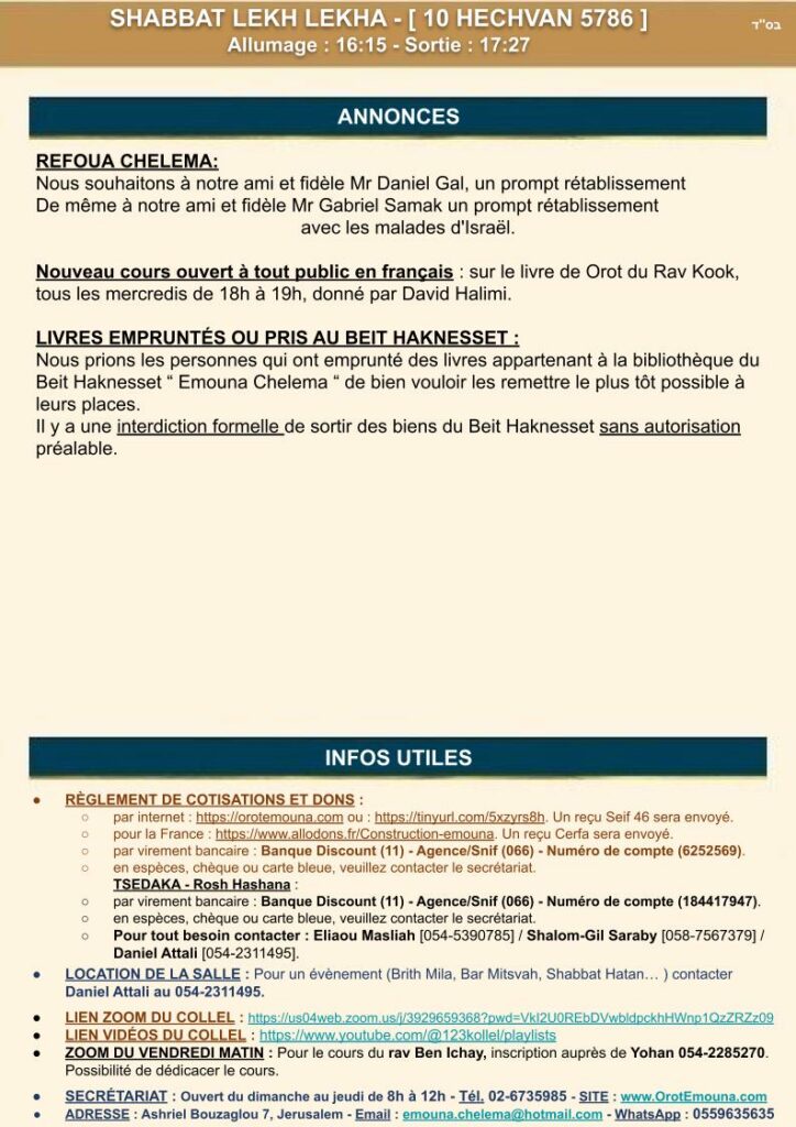 Chaque semaine, le Rav Yehouda Ben Ichay rédige la « Daf Kecher » relative à la paracha de la semaine. Vous y trouvez également les horaires de Shabbat (et des fêtes le cas échéant) ainsi que les dernières actualités.