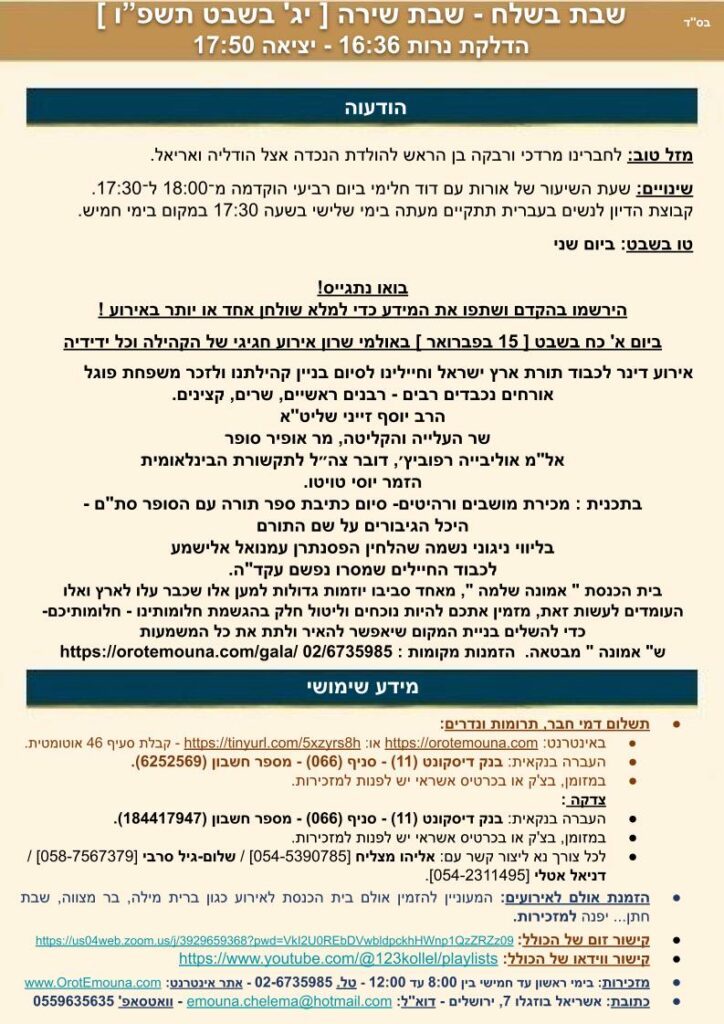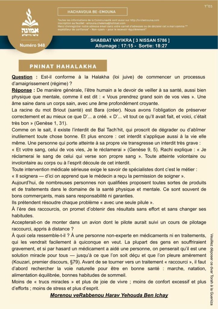 Chaque semaine, le Rav Yehouda Ben Ichay rédige  la « Daf Kecher » relative à la paracha de la semaine. Vous y trouvez également les horaires de Shabbat (et des fêtes le cas échéant) ainsi que les dernières actualités.